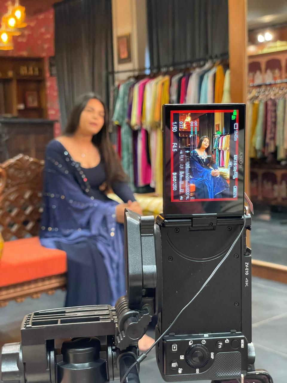 A compilation of professional photoshoots capturing fashionable eyewear, photography, and a woman in a clothing store.